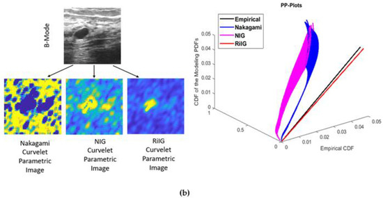 Comparing Nakagami, NIG, and RiIG statistical modeling with the aim of classifying images with (a) contourlet parametric (CP) images and (b) curvelet parametric (CP) images using percentile probability plots (pp-plots) that show empirical, Nakagami, NIG, and RiIG cumulative density functions (CDFs). It can be seen from both pp-plots that the RiIG CDF, as opposed to the Nakagami and NIG CDFs, closely tracks the empirical CDF. Additionally, it shows that for parametric modeling of breast ultrasound pictures, the RiIG distribution is more appropriate.