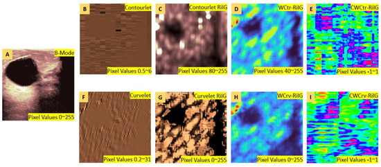 Example of transformation from B-Mode to CWCtr-RiIG and CWCrv-RiIG images at contourlet decomposition level-P4D32 and curvelet decomposition level-S4A32. (A) B-mode image, (B) Contourlet coefficient image, (C) RiIG modeled contourlet coefficient image, (D) RiIG modeled weighted contourlet coefficient (WCtr-RiIG) image, (E) RiIG modeled correlated-weighted contourlet coefficient (CWCtr-RiIG) image, (F) Curvelet coefficient image, (G) RiIG modeled curvelet coefficient image, (H) RiIG modeled weighted curvelet coefficient (WCrv-RiIG) image, and (I) RiIG modeled correlated-weighted curvelet coefficient (CWCrv-RiIG) image.