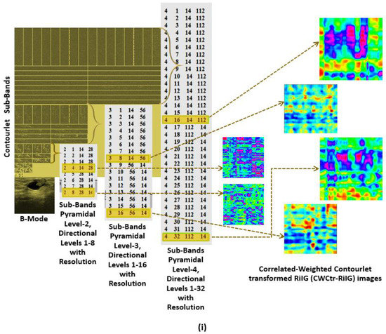 The CP images are linked with the appropriate contourlet and curvelet sub-band coefficient images to produce the CWCtr-RiIG and CWCrv-RiIG images. By executing correlation operations with the corresponding contourlet and curvelet sub-bands, the CP images’ parameter values are all weighted. The term “correlated-weighted contourlet- or curvelet-transformed RiIG” might be used to describe these images. Figure 6 displays the transformation from B-Mode image to correlated-weighted parametric imaging at contourlet decomposition level P4D32 and curvelet decomposition level S4A32 with corresponding image pixel value ranges. The transformation is progressing as at first the B-mode is transformed to a contourlet or curvelet transform coefficient image, then modeled by RiIG to obtain a contourlet or curvelet RiIG image. For comparison purposes, WCP [34] images (i.e., contourlet or curvelet coefficient are weighted by multiplication with their corresponding RiIG image to obtain WCtr-RiIG and WCrv-RiIG images) are also simulated. At last, the CWCtr-RiIG and CWCrv-RiIG images are simulated, except weighted by correlation rather than multiplication. To reduce the computational time for constructing CWCtr-RiIG and CWCrv-RiIG images, six sub-bands from the contourlet transform’s pyramidal decomposition at levels 2, 3, and 4 and the curvelet transforms decomposition at scales 2, 3, 4, and 5 are carefully selected as being the most ideal for feature extraction, where in contourlet, those pyramidal levels contain 8, 16, and 32 directional sub-bands, and in curvelet, those scale levels contain 16, 32, 32, and 64 angle sub-bands, respectively. In this study, contourlet directional sub-bands in each pyramidal level and curvelet angle sub-bands in each scale with larger sizes are taken into consideration because they predicted the best results than the other sub-bands. Therefore, the chosen sub-bands for contourlet analysis are pyramidal level-2 directional level-4 (P2D4), as well as P2D8, P3D8, P3D16, P4D16, and P4D32, which are shown in Figure 7i. For the curvelet domain, the chosen sub-bands are scale-2 angle-16 (S2A16), as well as S3A32, S4A32, S5A16, S5A32, and S5A64, which are shown in Figure 7ii. As previously stated, the primary rationale for choosing these sub-bands is that they offer the maximum resolution for the images, which is crucial for the classification process.