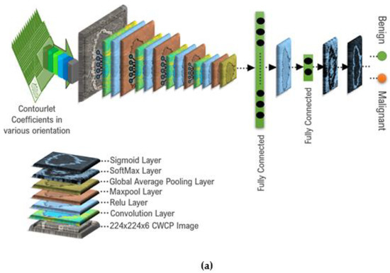 In this study, it is demonstrated that an extremely successful model is the Rician inverse Gaussian (RiIG) distribution, which comprises the statistics of the contourlet and curvelet coefficient images [33]. It has been demonstrated that the features derived by the CNN network from the RiIG statistically modeled (i.e., parametric) images, compared with features extracted from US B-mode images, provide a higher level of accuracy for breast tumor classification. Firstly, the contourlet and curvelet transform are applied to the US B-mode images to obtain contourlet and curvelet coefficient (C) images. The next step is to create contourlet or curvelet parametric (CP) images by substituting a pixel from the coefficient (C) image with the estimated RiIG parameter (), which is carried out over a local neighborhood of the corresponding pixels with the requested parameter taken into account at the neighborhood’s center. The parameter values that produce the CP image are, therefore, transformed (-mapped) from the pixel values. To enhance the precision of the statistical characteristics in classification, correlated-weighted contourlet (Ctr)- or curvelet (Crv)-transformed parametric (CWCtrP or CWCrvP) images are introduced. The contourlet or curvelet parametric (CP) images are correlated with their matching contourlet- or curvelet-transformed coefficient (C) images to create the CWCtrP or CWCrvP images. As a result of applying correlation with the relevant contourlet or curvelet coefficient (C) images, weights were assigned to each parameter of CP images; the term “correlated-weighted” is being utilized in this system. In this work, the CWCtrP and CWCrvP images are used to classify breast tumors in a deep CNN architecture. The proposed methods subject fully connected layers and a variety of machine learning classifiers, including the support vector machine (SVM), k-nearest neighbor (KNN), random forest, etc., to the features extracted from the proposed deep CNN’s global average pooling layer.