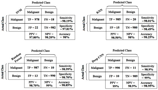 Applying this combined activation function, the accuracy, sensitivity (true positive rate), and specificity (true negative rate) is attained at 98.95%, 98.9%, and 99%, respectively, with an F1 score of 0.99, which means that although the accuracy is not changed, the F1 score slightly increases. In the deep learning-based classification task, each value after a point with a high accuracy (such as 98%) is significant. Table 4 makes it clear that RiIG was more appropriate for the B-mode statistically modeled images, as it proved to be more effective than the Nakagami and NIG statistical models for all four classifiers in Database-I, -II, and -III. Additionally, the findings showed that a deep CNN-based classification scheme with a fully connected classifier provided better accuracy than other machine learning classifiers. In the SVM machine learning classifier-based approach, the highest accuracy is obtained in Database-III, where the accuracy, sensitivity, specificity, PPV, and NPV are 98%, 98.19%, 97.81%, 97.80%, and 98.20%, respectively. In the case of KNN, the highest performance is obtained in Database-III, where the accuracy, sensitivity, specificity, PPV, and NPV are 98.25%, 98.01%, 98.49%, 98.50%, and 98%, respectively. In the case of random forest, the best performance is also obtained in Database-III, where the accuracy, sensitivity, specificity, PPV, and NPV are 98.85%, 98.99%, 98.7%, 98.7%, and 99%, respectively. For the deep CNN fully connected classifier the overall best performance is obtained regarding the accuracy, sensitivity, specificity, PPV and NPV are 98.95%, 98.9%, 99%, 99%, and 98.9%, respectively. The suggested RiIG-based CWCtr-RiIG images are the best option for the categorization of breast tumors in both the deep CNN fully connected classifier-based approach and the machine learning classifier-based approach, as shown in Table 4. The confusion matrices in terms of best performance with Database-III, shown in Figure 9, display the suggested methods using the deep CNN, SVM, KNN, and random forest classifiers along with performance indices such as accuracy, sensitivity, and specificity as well as PPV and NPV, involving measuring malignant tumors as true positives (TP), benign tumors as true negatives (TN), false positives (FP), and false-negatives (FN), respectively. The greatest values of accuracy, sensitivity, specificity, PPV, and NPV for Database-III, utilizing both categorization systems, are seen to be greater than 98%.