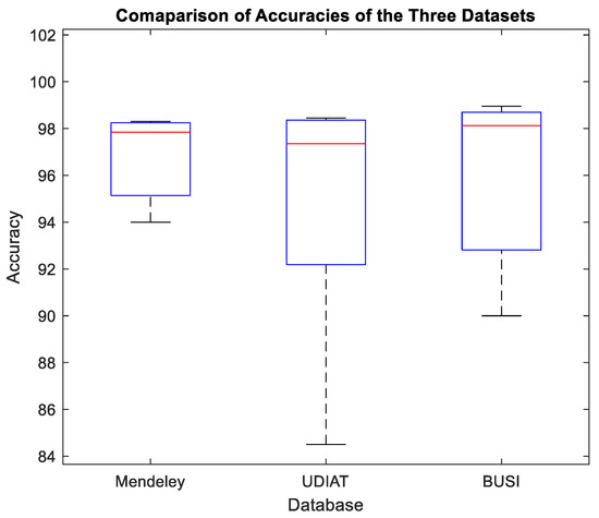 The best classification accuracy is demonstrated in the previous section using the deep CNN classifier with the RiIG-based CWCtr-RiIG pictures. Table 5 offers a comparison with comparable works. Using the same Database-I, P. Acevedo et al. [5] claimed a 94% accuracy, with a 0.942 F1 score, while Karthiga et al. [20] reported 94.5% accuracy, with a 0.945 F1 score. In light of this, the highest level of accuracy made possible by the proposed method employing the same Database-I is roughly 98.30% and has an F1 score of 0.983, which is noticeably better. Hou et al. [29] employed Database-II in a different study and reported a 94.8% accuracy rate. Combining the same Database-II with additional databases, Shin et al. [30] found an accuracy of 84.5%. According to Byra et al. [31], utilizing Database-II, their accuracy was 85.3%, and their F1 score was 0.765. With an F1 score of 0.942 with Database-II, Qi et al. [32] demonstrated an accuracy of 94.48%. On the other hand, the suggested approach employing Database-II offers the highest accuracy, 98.45%, and an F1 score of 0.985. With Database-I, Kabir et al. [34]’s accuracy was 98.25%, and their F1 score was 0.982; for Database-II, it was 98.35%, and their F1 score was 0.984; and for Database-III, it was 98.55%, and their F1 score was 0.986. The approach of Ka Wing Wan et al. [42] yields accuracy for Database-III of 90% using a random forest classifier and 91% using a CNN, with an F1 score of 0.83. The identical Database-III was used by Moon et al. [43], who reported 94.62% accuracy, with a 0.911 F1 score. The accuracy and F1 score of the suggested method, in comparison, are superior, with the greatest accuracy being roughly 98.95% and an F1 score of 0.99. Additionally, using the same validation strategy as in [42,43], the suggested dual input CWCtr-RiIG image-based deep CNN technique is deployed for classification on Database-III, with an 80% training to 20% testing ratio. With an F1 score of 0.98, this experiment’s accuracy, sensitivity, and specificity ratings are still better than those of [42,43]. The box plots in Figure 10 show a comparison of the accuracy of Table 5, and they also show that the proposed method performs consistently with other approaches. As mentioned earlier, the images in Database-I have undergone speckle reduction, compressed dynamic range, and persistence pre-processes. For Database-II and -III, the images have undergone edge enhancement, speckle reduction, and persistence only. Due to the heavily compressed dynamic range, the resultant accuracy using Database-I is lower than that of Database-II and -III. Moreover, if we combined the images of Database-II and -III, the classification accuracy attained 98.4%, while by combining the images of the three databases, the classification accuracy fell to 97.15%. Therefore, it seems that an automated edge enhancement process may further improve the performance in the case of Database-I. However, incorporating an edge enhancement technique will increase the complexity of the method. It is an interesting area of future exploration to develop a novel neural network architecture that can deliver a high degree of accuracy even with heavily compressed dynamic range images by additional pre-processing such as edge enhancement.