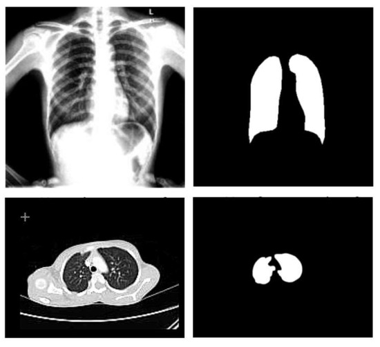 Sample X-ray and CT images before and after the segmentation step.