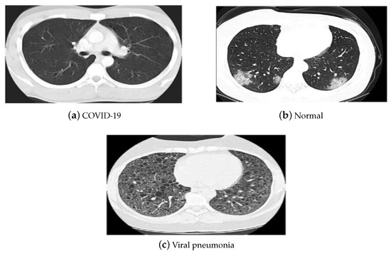 The China National Center for Bio-information CT chest imaging data set [53] was also employed in our investigations. The images of the data set are classified as coronavirus pneumonia, common pneumonia, and normal. The data set includes 617,775 CT slices from 6752 CT scans for 4154 patients. It consists of CT images for 999 COVID-19 patients, and 1687 normal and 1468 common pneumonia patients. Figure 5 depicts the CT samples of the utilized data sets leveraged in our investigations.