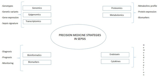 Today, omics technologies are advancing rapidly, and many datasets can be extrapolated from both individuals and patient populations [49]. Furthermore, because of the complex nature of sepsis, omic analysis, integrated with clinical input disease characteristics, can be useful to identify pathologically relevant biomarkers. For example, omics can be generally helpful in the sepsis context for discovering (1) biomarkers to distinguish between infectious and non-infectious causes, (2) prognostic indexes, (3) biomarkers linked with therapy, and (4) markers to predict individual patient response to therapy and to apply precision medicine [54].
