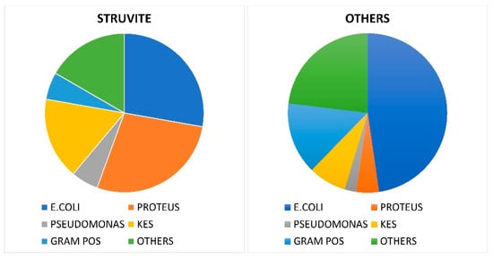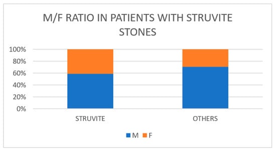 In accordance with previous findings, our results confirmed an Escherichia coli infection rate of approximately 40% in patients with urinary stones in general, but a lower rate of Escherichia coli of 27.7% in the group of patients with struvite stones. A finding of our study that deserves to be exhaustively discussed is the finding of a negative urine culture in a considerable proportion of patients with struvite stones. This finding agreed with the observations of other authors, who failed to demonstrate the presence of bacteria in the urine and stones of several patients with struvite calculi [,,,].