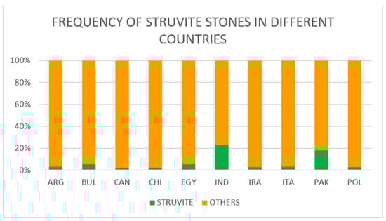 We observed the highest frequency of struvite stones in India (23%) and Pakistan (18%). A high frequency of struvite stones is associated with a high prevalence of urinary tract infections in these geographical areas. Studies have shown that in large areas of India there are hygienic and sanitary conditions that favor a high prevalence of urinary tract infections, especially in women. In poorer settings of India, menstrual hygiene management practices can be particularly unhygienic for girls and women, depending on the socioeconomic status, education level, local traditions and beliefs and access to water and sanitation resources []. Furthermore, there are no facilities for the screening and diagnosis of urinary tract infections at peripheral government health centers. The rate of urinary tract infections among pregnant women attending antenatal clinics of district hospitals is high []. Finally, studies have highlighted the increasing rate of antimicrobial resistance among uropathogens in the community settings of India []. Similarly, a high frequency of urinary tract infections has been observed in Pakistan among pregnant women and women attending gynecology clinics [,].
