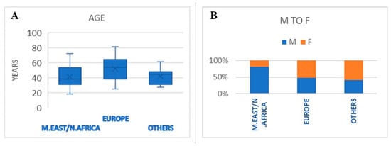 The mean age of the patients with struvite stones from European countries (51.6 ± 16.7 years) was higher than the mean age of the patients from the areas including Egypt, Iraq, Pakistan and India (41.2 ± 13.6 years) as well as other countries (41.8 ± 10.2 years) (p = 0.042). The M/F ratio was clearly in favor of males in the areas including Egypt, Iraq, Pakistan and India whereas it was slightly in favor of females in European countries and in other countries (p = 0.032) (Figure 3A,B).