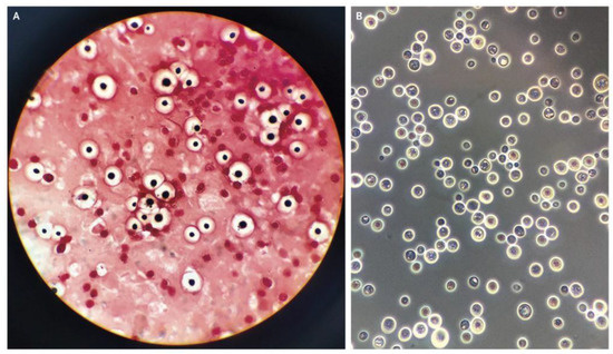 (A) Gram staining, (B) India ink-stained smear of encapsulated, round yeast cells and C. neoformans [17].