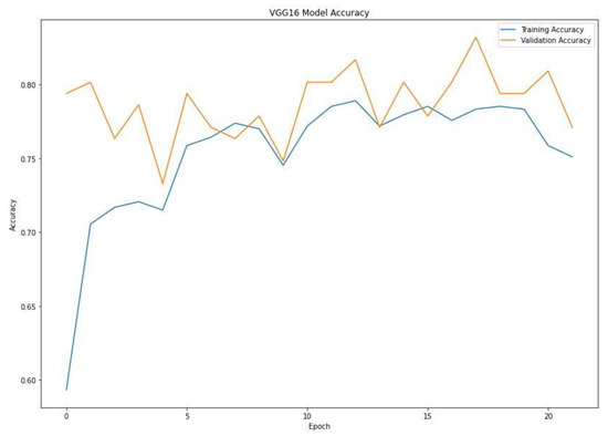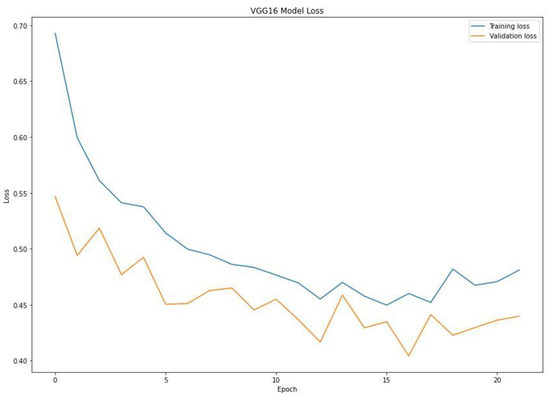 When training a machine learning model, one of the main things to avoid is overfitting. This is when the model fits the training data so well that it cannot generalize and make accurate predictions for data it has not seen before (test data). Metrics on the training data indicate how well the model is progressing in terms of its training, but it is the metrics on the validation data that provide the measure of the quality of a model—how well it can make new predictions based on data it has not seen before. Figure 7 shows the accuracy obtained during training and validation. The training and validation accuracy in a typical learning curve is expected to increase with each epoch. The VGG16 model accuracy increased with a corresponding validation accuracy. This generates a good fit void of overfitting and underfitting. The training and validation loss are the terms used to measure how a deep learning model fits the training and validation data. This indicates the performance of the model on the data. As indicated in Figure 8, the training and validation loss indicates how the VGG16 model fits the training and validation data and identifies which aspect needs tuning. The VGG16 generated a relatively stable good fit as the training and validation loss decreased and gradually stabilized. A high loss value usually means the model produces erroneous output, while a low loss value indicates fewer errors in the model. In addition, the loss is generally calculated using a cost function, which measures the error in different ways. Because of the nature of the study (binary classification), we adopted binary cross-entropy.