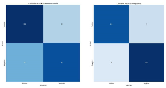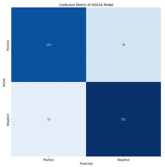 Compared with the two state-of-the-art pre-trained models, the VGG16 model significantly outperformed them with accuracy and loss of 86.88% and 0.36203, as shown in Table 5. Additionally, the model correctly classifies 245 images as positive and negative. In contrast, the ResNet50 and InceptionV3 correctly classify 197 and 235 images. Furthermore, ResNet50 and InceptionV3 misclassify 85 and 47, respectively. In retrospect, the VGG16 only misclassifies 37 images, as shown in Figure 10.