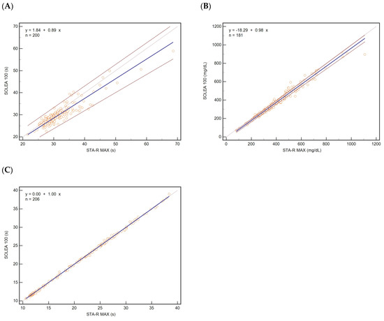 5]. The comparison shows Spearman’s correlation coefficients comparable to those obtained in this study for the Biolabo Solea 100: for PT, it is about 0.97; for FIB, it is between 0.95 and 0.97; and for APTT, it is between 0.74 and 0.88 [
