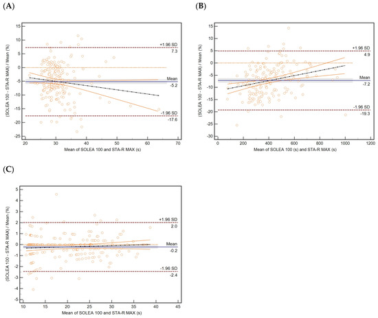 The applicability of the Passing–Bablock analysis method was ascertained with the CUSUM test for linearity, which is commonly used to evaluate the linear relationship among the results of the reference methods and those tested. For ATPP, FIB, and PT, the p-value was greater than 0.05 (APTT, p = 0.8; FIB, p = 0.5; and PT, p = 0.9).