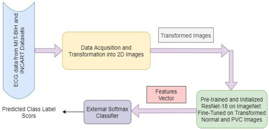 Firstly, the annotation files from each record of both datasets (MIT-BIH and INCART) were received by the python Glob module and processed with WFDB Toolbox and Biosppy module to segment the available normal and PVC beats in a record. The R-peaks detection from the QRS-complexes is performed with the Pan–Tompkins algorithm [51] with a sampling frequency of 200 Hz. After detecting R-peaks, a single beat is counted by any R-peak and its next R-peak, taking half distance of those. Matplotlib and OpenCV python modules transform the segmented beats into the equivalent RGB images. Herein, time-series ECG signals are converted into 2D RGB images, which are fed as the input of the pre-trained ResNet-18 to extract the desired features from normal and PVC beat images. A high-level feature vector is constructed from these features, and finally, PVC is identified based on that vector through a Softmax classifier.