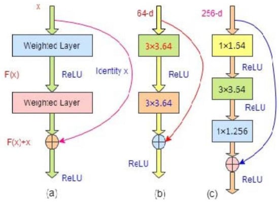 Figure 2b expresses the building block of ResNets-18/32, while Figure 2c for ResNet-50/101/152 holds three layers: 1 × 1, 3 × 3, and 1 × 1 convolutions. The foundation of a CNN is the convolutional layers. It has a number of kernels or filters, whose settings must be learned over the course of training. Herein, 1 × 1, 3 × 3, 1 × 1 and 64, 256 represent the kernel sizes and kernel number respectively for the assigned convolution layers in a CNN. Typically, the filters’ size should be smaller than the original images in 2D CNNs. Each filter convolves the images to produce a map of activation. For the convolution, the filter is slid over the image’s width and height, and at each spatial location, the dot product between each filter element and the input is determined. The same procedure is repeated for each component of the input image to create the activation map. The activation maps of each filter are stacked along the depth dimension to create the convolutional layer’s output volume. Every element of the activation map can be considered to be a neuron’s output. As a result, each neuron is connected to a discrete local area in the input image, and the area’s size is equal to the filter’s size. All of the neurons in an activation map share parameters as well. The convolutional layer’s local connection forces the network to learn filters that respond most strongly to a particular local region of the input. The early convolutional layers of an image capture its low-level details, such as its lines, whereas the later layers extract its high-level details, such as its forms and particular objects. The 1 × 1 layers (bottleneck layers) are liable for reducing and restoring or increasing (leaving 3 × 3 layer) the input/output dimensions to match the same dimensions in the building blocks of the network, where the projection shortcut of Equation (2) is employed. The interesting point is that both structures have the same time complexity [36].