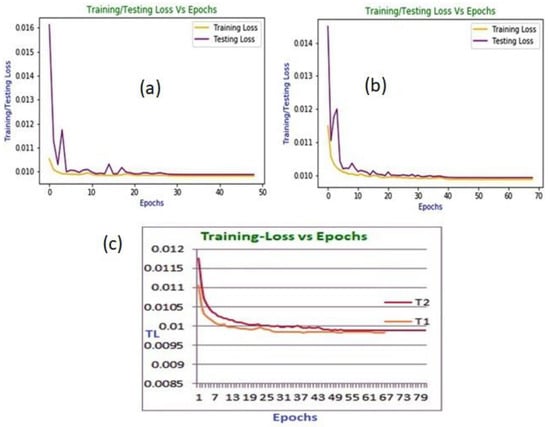 Figure 4. (a) The training and testing loss versus epoch curve in T3; (b) The training and testing loss versus epoch curve in T4; (c) The training loss versus epoch curves in T1 and T2.