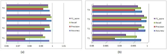 A summary of received overall accuracies, precisions, recalls, and F1-scores to identify the N and PVC for all experiments is shown in Table 2 and a bar graph for these metrics is illustrated in Figure 5a. The minimal validation losses are 0.0099, 0.0098, 0.0099 and 0.0099 in T1, T2, T3, and T4, respectively, during the training. Table 3 also demonstrates a summary of obtained metrics (accuracy, precision, recall, F1-score and specificity) from the received confusion matrixes for all the experiments and a bar graph is depicted in Figure 5b. After optimizing the parameters in experiments T1 and T2 over the classifier’s training set, we evaluated the classifier with those parameters in the testing phase, where identification samples (PVC beat images) come from different individuals. However, in experiments T3 and T4, the subjects are changed in each cross-validation fold for evaluation. This provides independent subject estimation, which is essential in resource constraint devices such as mobile, wearable/portable healthcare devices. Moreover, we have evaluated balanced accuracy for all experiments using the Equation (10) and achieved 99.58%, 99.85%, 99.94%, and 99.73% for T1, T2, T3, and T4, respectively, while accuracies are 99.74%, 99.89%, 99.93%, and 99.77%. The results express that accuracy and balanced accuracy are near to being achieved. We have also tested the results from the sklearn.metrics module of Python using sklearn.metrics.accuracy_score and sklearn.metrics.balanced_accuracy_score functions and received the more close results for both metrics [64]. Sometimes, balanced accuracy is also represented as the un-weighted average recall, where summing accuracies of all classes is divided by the total number classes.