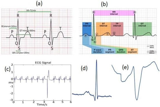 Figure 6. (a) A normal ECG signal including a typical P-QRS-T complex and RR-intervals; (b) A normal ECG signal with U-wave deflection; (c) A sample waveform of a PVC beat and normal beats from the MIT-BIH arrhythmia dataset of a record; (d) A sample of the extracted normal image from MIT-BIH; (e) A sample of the extracted PVC beat image from MIT-BIH.