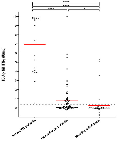MTB-specific Ag stimulated IFN-γ levels in Active TB patients, hemodialysis patients, and healthy individuals. Note: Whole blood of study subjects (active TB patients group, hemodialysis patients (HD) group, and healthy individuals (HI) group) were stimulated with MTB-specific antigens (early secretory antigen target 6, culture filtrate protein 10, and TB 7.7) for 24 h. The red line in the graph represents the mean value for each group. Active TB patients (n = 20); hemodialysis patients (n = 83), healthy individuals (n = 52); * p < 0.05, **** p < 0.0001.