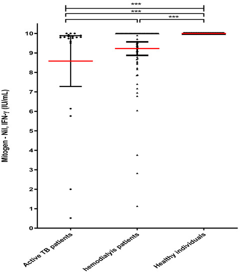 The aim of the present study was to evaluate the effectiveness of LTBI diagnosis using IGRA in a total of 20 patients with active TB, 84 patients on HD, and 52 healthy individuals. The IGRA test was performed by QuantiFERON TB Gold In-Tube (QFT-GIT) test (Qiagen, Hilden, Germany). Characteristics of MTB-specific Ags and phytohemagglutinin A (PHA)-stimulated IFN-γ levels were compared between HD patients and healthy individuals.