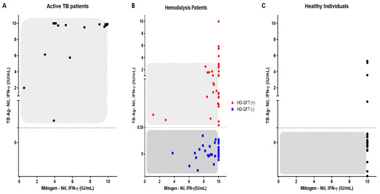 The correlation coefficient graph of MTB-specific Ag stimulated IFN-γ levels and PHA-stimulated IFN-γ levels is shown in Figure 3. A total of 85% of patients with active tuberculosis had PHA-stimulated IFN-γ levels below 10 (Figure 3A). Of 83 HD patients, 33 (39.8%) had PHA-stimulated IFN-γ levels below 10, while14 (41.2%) of HD patients with LTBI and 19 (38.8%) non-LTBI HD patients, respectively, also had PHA-stimulated levels below 10 (Figure 3B). On the other hand, none of the healthy individuals had PHA-stimulated IFN-γ levels below 10 (Figure 3C).