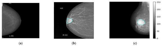 Some examples of real breast cancer mammograms. Normal, benign, and malignant cases are depicted in (a–c), respectively. The breast lesion localization is accurately superimposed on the breast mammograms of benign and malignant cases via the cyan color counter.