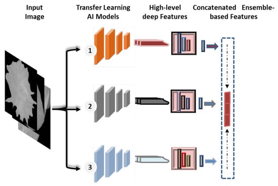 Recently, the concept of ensemble learning has been employed in place of a single deep learning model in order to learn several deep learning models [11,52]. Therefore, the prediction process is finally done by merging multiple different models. This makes it possible to take advantage of more useful information from the different classifiers and obtain more accurate classification results. In previous studies, most of the deep learning techniques for breast cancer prediction relied on a single convolutional network, as the applications of ensemble and transformer learning for the early detection of breast cancer are still in the infant stages, and some studies apply to histopathological images. In this paper, the ensemble learning method was built by selecting the best set of pre-trained deep learning models as a main structure for the extraction of features. As illustrated in Figure 5, this paper’s ensemble technique concatenates pre-trained deep learning models for feature extraction.