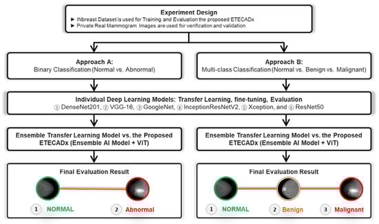 The evaluation prediction results are presented in this section for Approach A (binary classification) and Approach B (multi-class classification) as shown in Figure 6. For each approach, the results of individual AI-based CNN model are presented first. Then, the comparison results between the ensemble learning model as well as the proposed ETECADx are consecutively demonstrated.