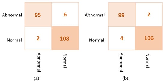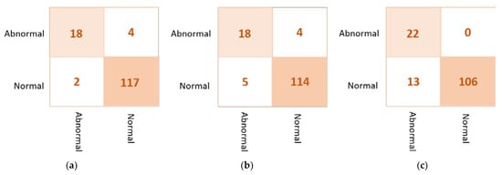 Based on the confusion matrix, the DenseNet201 and VGG16 achieved the best prediction performance with only six cases wrongly classified (four in abnormal class and two in normal class). The InceptionResNetV2 misclassified five abnormal cases as normal. The Xception achieved good classification behavior to accurately distinguish the normal cases, but it is the worst to predict the abnormal cases where the false negative is very high at thirteen cases. Figure 7 shows examples of the confusion matrices of the three AI-based CNN models: DenseNet201, InceptionResNetV2, and Xception.