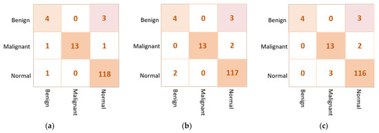 Example of the confusion matrices in the binary approach for individual pre-trained models using INbreast testing set: (a) DenseNet201, (b) InceptionResNetV2, and (c) Xception.