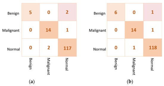 Based on the results of the individual pre-trained AI models, DenseNet201, VGG16, and InceptionResNetV2 are used to build the ensemble backbone network for the binary approach of the proposed ETECADx system. In this section, we perform the evaluation performance in two steps. First, the ensemble learning model is constructed, trained, and evaluated separately without using the ViT. Second, we construct the proposed hybrid model by allowing the ViT to perform the final prediction performance based on the ensemble high-level deep features that are generated by fusing three different CNN models: DenseNet201, VGG16, and InceptionResNetV2. The evaluation performance results of the breast cancer diagnosis using the ensemble learning and the proposed hybrid ETECADx are summarized in Table 5. It is clearly shown that the proposed AI ETECADx model could achieve the superior diagnosis evaluation results when the ensemble learning model is used. Figure 8 presents the confusion matrices for the proposed ensemble learning and ETECADX AI models for the binary classification approach.