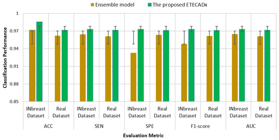 Binary approach classification evaluation performance of the proposed ETECADx framework against the ensemble learning model using the testing set of INbreast dataset.