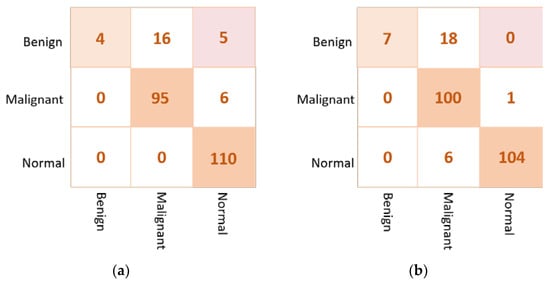 Evaluation performance in terms of the confusion matrices of the proposed AI models. (a) Ensemble learning as a backbone model and (b) the proposed AI-based ETECADx model.