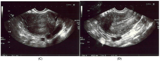 (A,B) The left and right ovaries, with their diameters. The right ovary measured 25 × 15 mm and the left ovary 24 × 14 mm. (C) The transverse plan of the uterus at its widest dimensions. In this plane, the uterine width (Ut-W) was measured. The uterus was of normal size in anterior flexion. (D) The midsagittal plane of the uterus showing the uterine fundus, myometrium, endometrium (6 mm thick), isthmus, cervix and cul-de-sac.