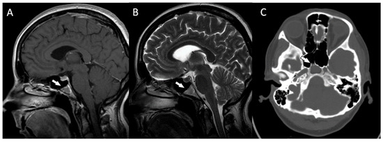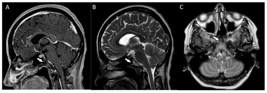 (A,B) The postoperative magnetic resonance T1-weighted and T2-weighted sagittal images and the postoperative magnetic resonance T2-weighted coronal image (C) showing some minimal residual lesions within the clival region (arrows).