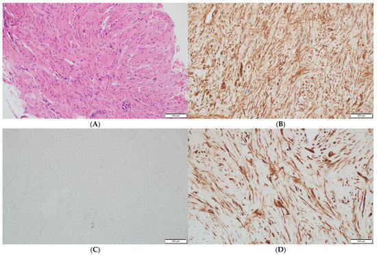 The differential diagnosis also suggested a bone desmoplastic fibroma, which produces similar microscopic images and immunoprofile to those of a leiomyoma. However, in those cases, immunohistochemical staining for beta-catenin can clarify the diagnosis as it is positive for desmoplastic fibromas but negative for leiomyomas [19].