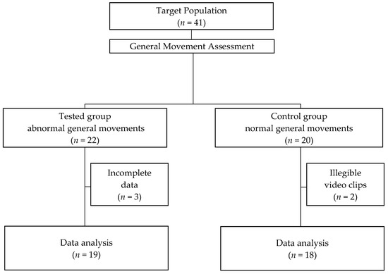 A group of 20 individuals with (1) normal brain ultrasound findings and (2) normal FMs at 12–14 weeks after term, matched for sex and age (in a 1:1 case-control manner) to the children from the study group, were enrolled sequentially in the study as a control group. As the video clips of two participants were illegible, it was decided to omit them in the final analysis; therefore, 18 infants (6 girls and 12 boys) were included in the study analyses (Figure 1).