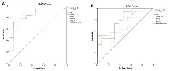 The ROC curves and the optimal cutoff point for individual postural parameters in two conditions of examination in supine (A) and prone (B) positions are presented in Figure 3. The diagonal line represents no discrimination, while the curves represent the sensitivity and specificity of individual postural parameters at different cutoff points.