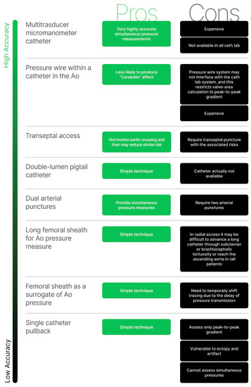 In this case, a catheter is advanced across the aortic valve while the side port of a femoral sheath serves as a surrogate for central aortic pressure. It is a simple technique but is limited by the need to temporally shift tracing due to the inherent delay of pressure transmission between the LV and femoral artery, which tend to over- or underestimate the severity of AS.