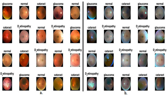 In this work, the performance of the proposed methods was assessed and generalised on CFP images for an eye disease dataset. The dataset images were collected from many sources such as Oculur Recognition, the Indian Diabetic Retinopathy Image Dataset (IDRiD), and High-Resolution Fundus (HRF), which consists of 4217 CFP images of three types of eye diseases and a normal class; this dataset is called the OIH dataset. The dataset contains nearly balanced classes; the cataract class contains 1038 images, and the diabetic_retinopathy class contains 1098 images. The glaucoma class contains 1007 images, and the normal class contains 1074 images. Figure 2a presents some sample images of CFP for the ophthalmic dataset [30].