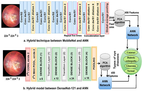 Here, we discuss the hybrid approach based on integrating features from two models, MobileNet and DenseNet-121, and their classification using an ANN [36]. This technique has been applied for several reasons, the most important of which is the representation of fundus images with very accurate features by merging the features from MobileNet with the DenseNet-121 model. The ANN also trains the dataset faster than CNN models with high classification accuracy.