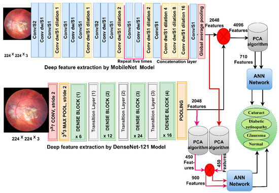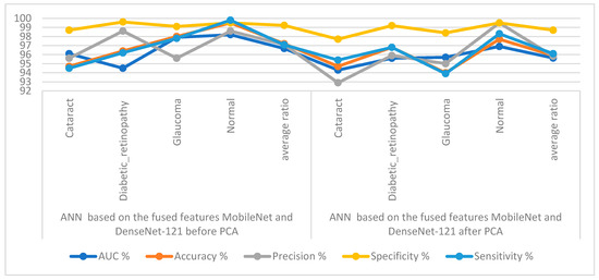 In this section, CFP images from the eye disease dataset were classified using the feature fusion MobileNet and DenseNet-121 models. It is worth noting that the first method depends on extracting the features from DenseNet121 and MobileNet separately and then fusing the MobileNet and DenseNet-121 features. Then, the features are reduced with PCA and classified using the ANN [37]. The second method is based on using MobileNet and DenseNet121 separately for extracting the features and then decreasing the features separately with PCA separately. Then, the selected features are melted with PCA and sent to the ANN for classification.