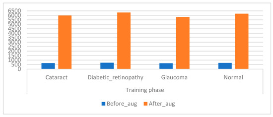 CNN models have high capabilities in training huge datasets; the more data in the dataset, the better the CNN performance. Unfortunately, medical images are scarce, and there are privacy concerns when obtaining medical images from hospitals. Hence, this presents a challenge for CNN models, which causes an overfitting problem when using a CFP image from an eye disease dataset that lacks sufficient medical images to train CNN models [43]. This limitation has been solved by using the data augmentation process during the training phase. This method contains several operations to increase images from the same dataset artificially. The operations to increase images include flipping images, rotating them at several angles, shifting them, and others. Table 2 describes the training dataset from the original and after the increase in images. Figure 6 presents an illustration showing the increased images prior to and after data augmentation.