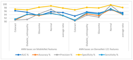 Display showing the ANN performance according to the MobileNet and DenseNet-121 features of the eye disease dataset classification.