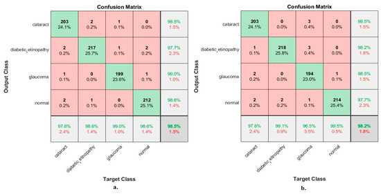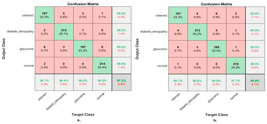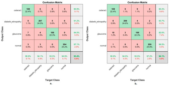 Confusion matrix measuring the ANN performance for classifying an eye disease dataset according to fused features from DenseNet121 and MobileNet (a) before using PCA and (b) after using PCA.
