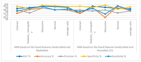 Figure 12 illustrates the confusion matrix for measuring the ANN performance when classifying the CNN (MobileNet and DenseNet-121) and handcraft features. With the fused MobileNet and handcrafted features, the ANN attained the following accuracies for each class: 97.6% for cataracts, 98.6% for diabetic retinopathy, 99% for glaucoma, and 98.6% for the normal class. In contrast, with the fused DenseNet-121 and handcrafted features, the ANN attained the following accuracies for each category: 97.6% for cataracts, 99.1% for diabetic retinopathy, 96.5% for glaucoma, and 99.5% for the normal class.
