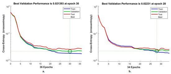 Cross-entropy is an ANN measurement tool for analysing CFP pictures to diagnose an eye disease dataset. The tool calculates the error in the target and the output in each period during all stages [42]. The network records each stage’s performance in different colours, as shown in Figure 14. The red colour shows the ANN measurement in the training stage, green indicates the ANN measurement in the validation stage, and blue indicates the ANN measurement in the testing stage. It is noted that the ANN, when fed with the MobileNet and handcrafted features, achieves superior performance with an error value of 0.021393 at epoch 30. In contrast, the ANN, when fed with the Dense-Net-121 and handcrafted features, achieves superior performance with an error value of 0.02231 at epoch 28.