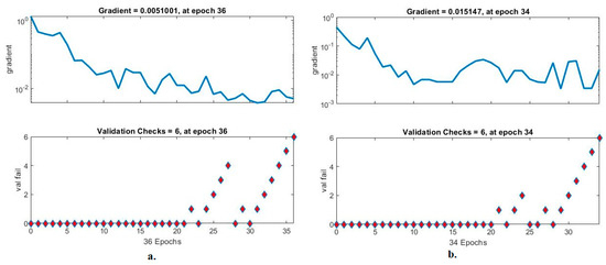Gradient and validation checks for measuring the ANN performance for classifying an eye disease dataset according to the fused (a) MobileNet and handcrafted features and (b) DenseNet-121 and handcrafted features.