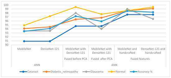 In Table 6 and Figure 16, the results of the methods for classifying CFP pictures for the eye dataset are discussed. The table summarises accuracy in addition to each system’s accuracy at the class level. For the cataract class, the ANN reached the best accuracy with a percentage of 97.6% when provided with the fused CNN and handcrafted features. For the Diabetic_retinopathy class, the ANN attained an accuracy of 99.1% when provided with the fused DenseNet-121 and handcrafted features. For the glaucoma class, the ANN attained an accuracy of 99% when provided with fused MobileNet and handcrafted features. For the normal class, the ANN reached an accuracy of 99.5% when provided with fused handcrafted and Dense-Net-121 features in addition to providing the ANN with the fused features from MobileNet with DenseNet-121.