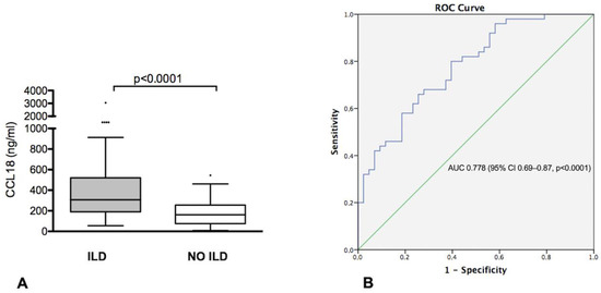 (A) CCL18 serum levels in idiopathic inflammatory myopathies (IIMs) patients with and without interstitial lung disease (ILD); (B) ROC curve illustrating the diagnostic value of CCL18 for diagnosis of ILD in patients with IIMs.